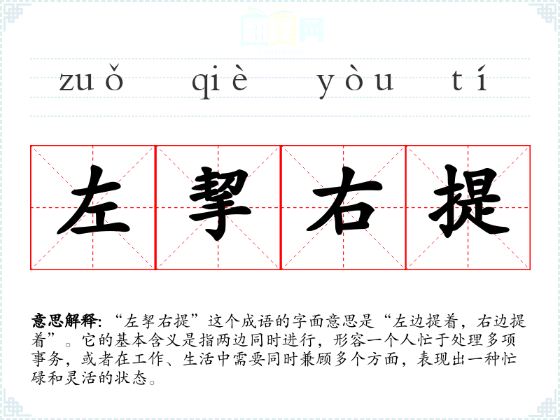 “左挈右提”这个成语的字面意思是“左边提着,右边提着”。它的基本含义是指两边同时进行,形容一个人忙于处理多项事务,或者在工作、生活中需要同时兼顾多个方面,表现出一种忙碌和灵活的状态。