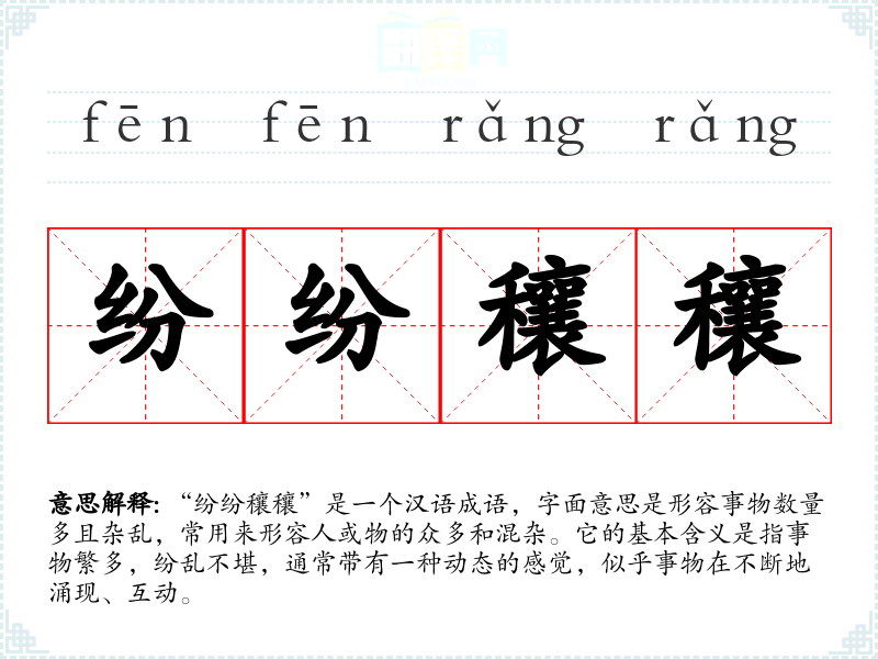 “纷纷穰穰”是一个汉语成语,字面意思是形容事物数量多且杂乱,常用来形容人或物的众多和混杂。它的基本含义是指事物繁多,纷乱不堪,通常带有一种动态的感觉,似乎事物在不断地涌现、互动。