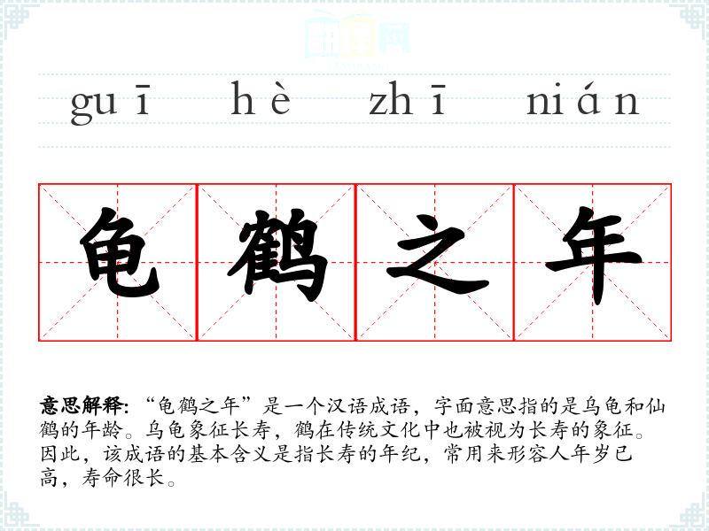 “龟鹤之年”是一个汉语成语,字面意思指的是乌龟和仙鹤的年龄。乌龟象征长寿,鹤在传统文化中也被视为长寿的象征。因此,该成语的基本含义是指长寿的年纪,常用来形容人年岁已高,寿命很长。