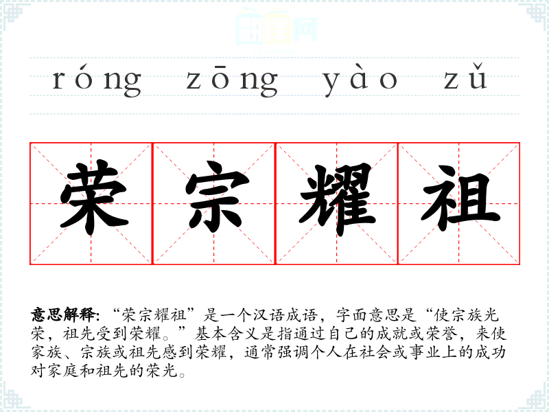 “荣宗耀祖”是一个汉语成语,字面意思是“使宗族光荣,祖先受到荣耀。”基本含义是指通过自己的成就或荣誉,来使家族、宗族或祖先感到荣耀,通常强调个人在社会或事业上的成功对家庭和祖先的荣光。