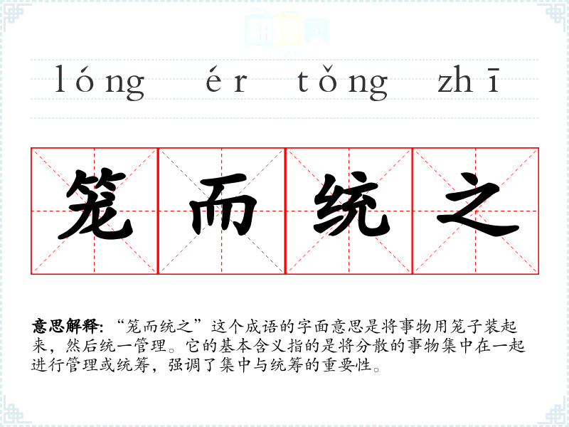 “笼而统之”这个成语的字面意思是将事物用笼子装起来,然后统一管理。它的基本含义指的是将分散的事物集中在一起进行管理或统筹,强调了集中与统筹的重要性。