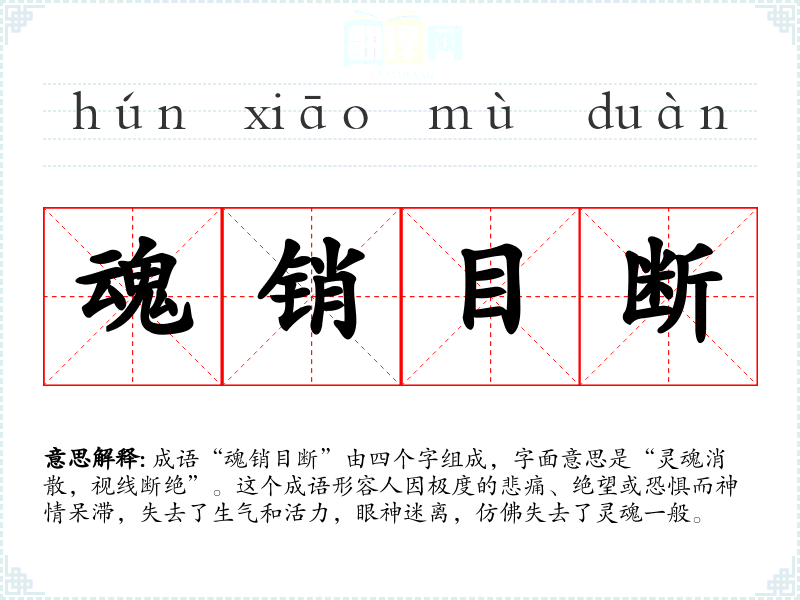 成语“魂销目断”由四个字组成,字面意思是“灵魂消散,视线断绝”。这个成语形容人因极度的悲痛、绝望或恐惧而神情呆滞,失去了生气和活力,眼神迷离,仿佛失去了灵魂一般。