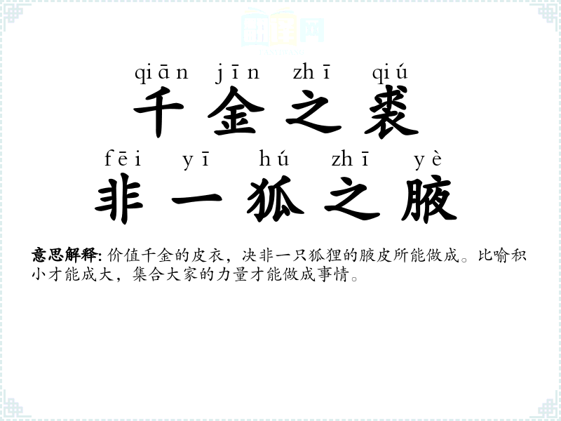 价值千金的皮衣,决非一只狐狸的腋皮所能做成。比喻积小才能成大,集合大家的力量才能做成事情。 |