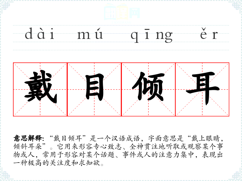 “戴目倾耳”是一个汉语成语,字面意思是“戴上眼睛,倾斜耳朵”。它用来形容专心致志、全神贯注地听取或观察某个事物或人,常用于形容对某个话题、**或人的注意力集中,表现出一种极高的关注度和求知欲。
