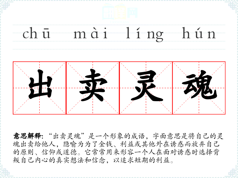 “出卖灵魂”是一个形象的成语,字面意思是将自己的灵魂出卖给他人,隐喻为为了金钱、利益或其他外在诱惑而放弃自己的原则、信仰或道德。它常常用来形容一个人在面对诱惑时选择背叛自己内心的真实想法和信念,以追求短期的利益。