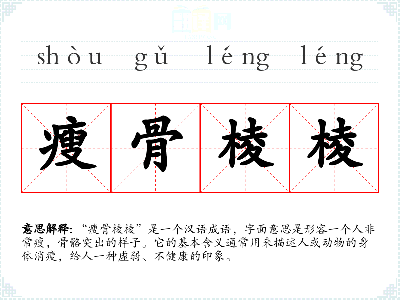 “瘦骨棱棱”是一个汉语成语,字面意思是形容一个人非常瘦,骨骼突出的样子。它的基本含义通常用来描述人或动物的身体消瘦,给人一种虚弱、不健康的印象。