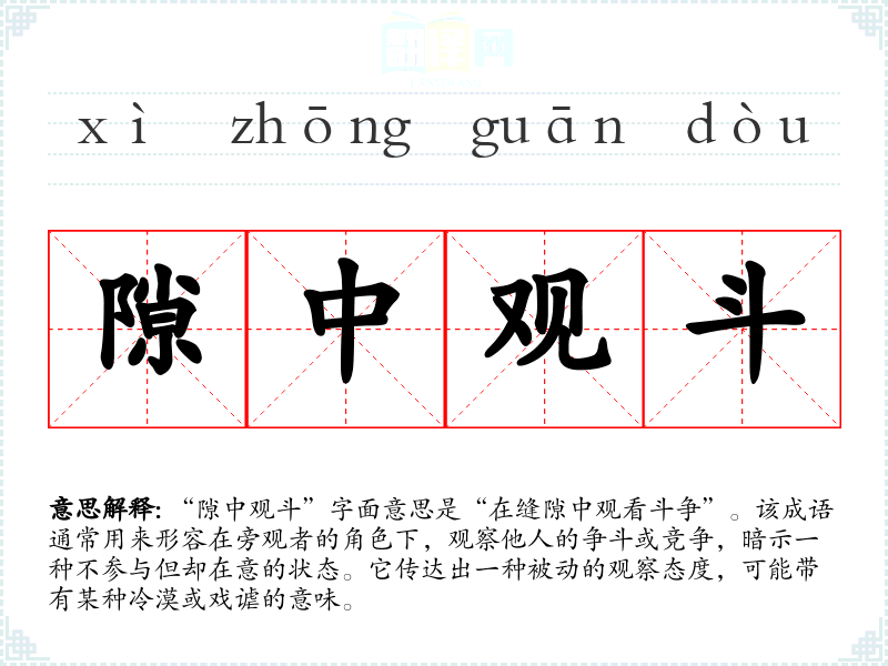 - 反义成语:参与其中、积极介入。二者都带有主动参与的含义,与“隙中观斗”的消极态度形成鲜明对比。