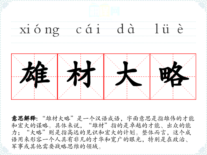 “雄材大略”是一个汉语成语,字面意思是指雄伟的才能和宏大的谋略。具体来说,“雄材”指的是卓越的才能、出众的能力;“大略”则是指高远的见识和宏大的计划。整体而言,这个成语用来形容一个人具有非凡的才华和宽广的眼光,特别是在政治、军事或其他需要战略思维的领域。
