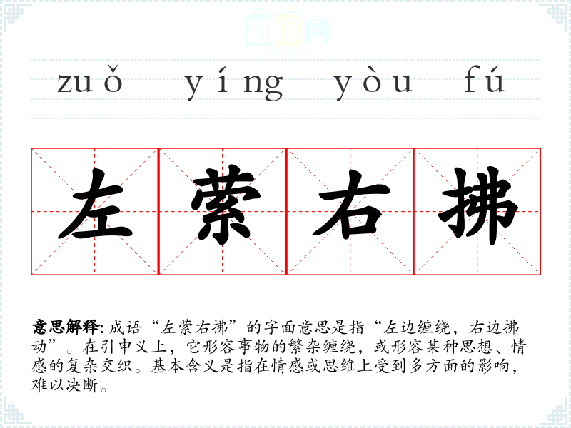 成语“左萦右拂”的字面意思是指“左边缠绕,右边拂动”。在引申义上,它形容事物的繁杂缠绕,或形容某种思想、情感的复杂交织。基本含义是指在情感或思维上受到多方面的影响,难以决断。