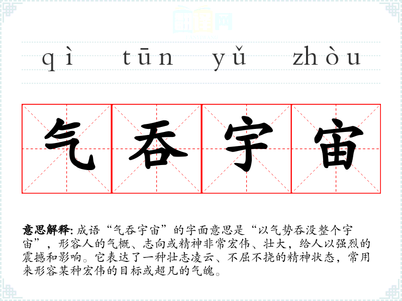 “气吞宇宙”并没有明确的历史典故,但它的构成元素可以追溯到古代**文学中对气概和宇宙的描绘。“气”在古代常指人的精神状态和气势,而“宇宙”则代表广阔的天地。因此,这个成语的使用反映了古代文人对人类精神力量的崇高追求。