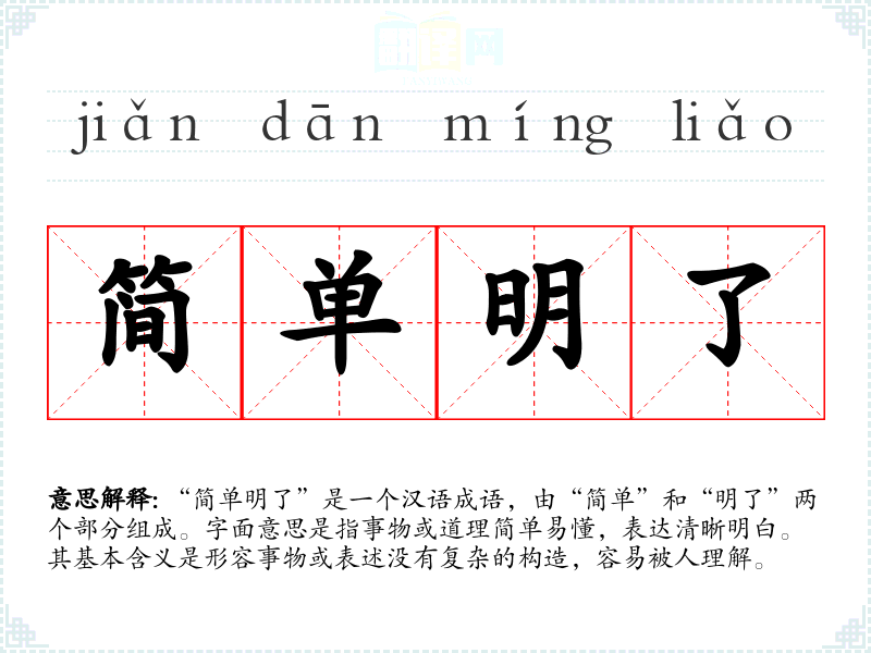 “简单明了”并没有明确的历史典故或文学出处,而是由现代汉语中常用的词语组合而成。它反映了人们对信息表达的追求,即希望在沟通中尽量减少复杂性,使得信息传达更为高效。
