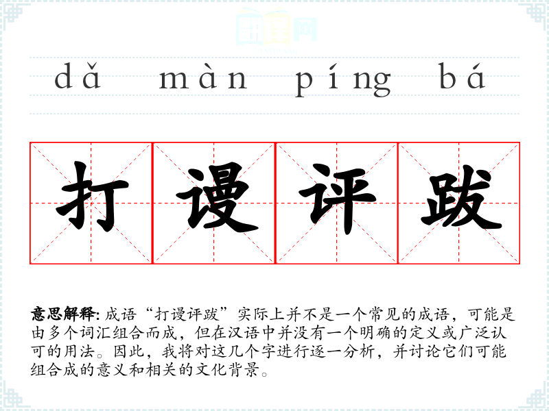 成语“打谩评跋”实际上并不是一个常见的成语,可能是由多个词汇组合而成,但在汉语中并没有一个明确的定义或广泛认可的用法。因此,我将对这几个字进行逐一分析,并讨论它们可能组合成的意义和相关的文化背景。