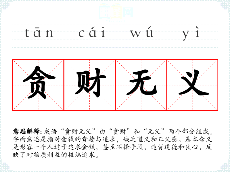 “贪财无义”并没有明确的历史典故或文学出处,但其反映的思想在**传统文化中有着深厚的背景。自古以来,儒家文化强调道德与伦理,反对贪婪与不义。许多古典文学作品中都探讨了因贪财而引发的道德沦丧与社会问题。