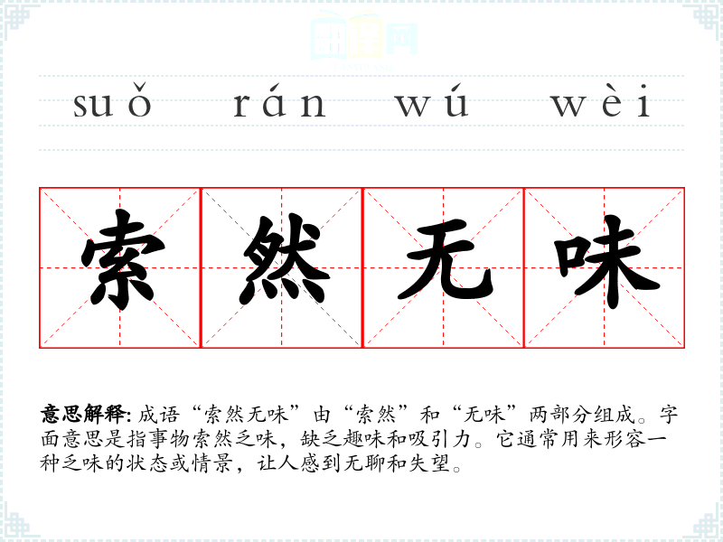 | 索然无味 | 索然:没有意味、没有兴趣的样子。形容事物枯燥无味(多指文章)。 |