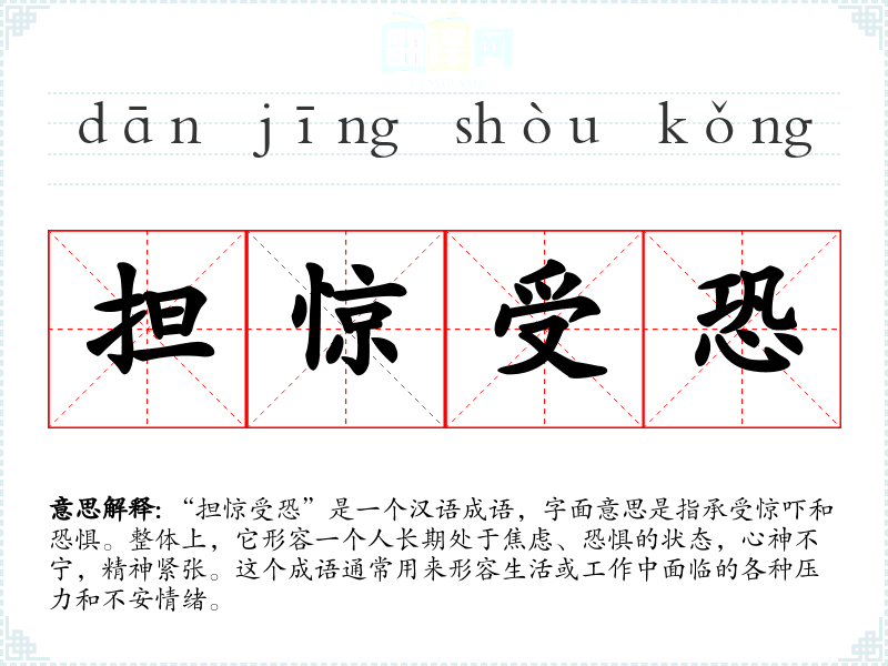 “担惊受恐”是一个汉语成语,字面意思是指承受惊吓和恐惧。整体上,它形容一个人长期处于焦虑、恐惧的状态,心神不宁,精神紧张。这个成语通常用来形容生活或工作中面临的各种压力和不安情绪。