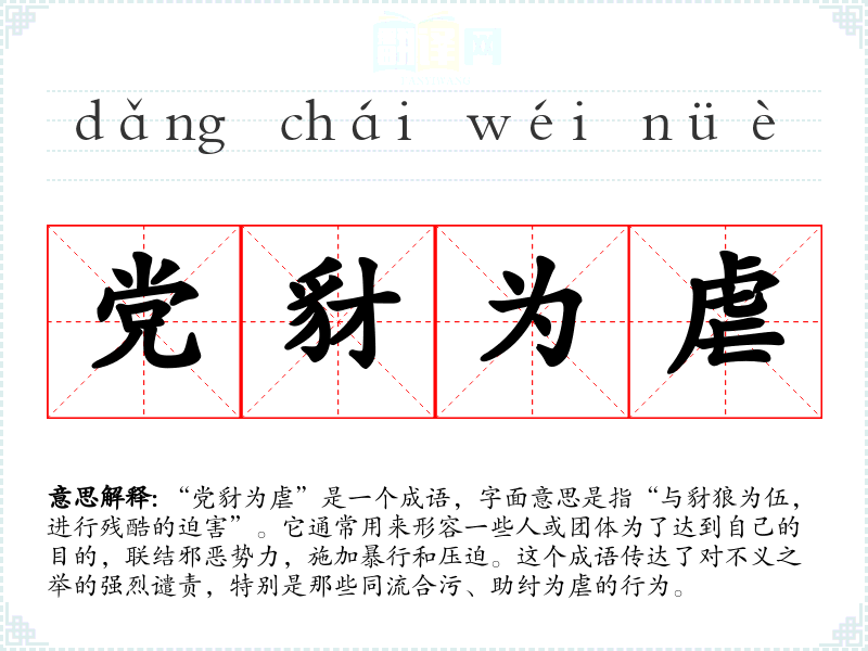“党豺为虐”是一个成语,字面意思是指“与豺狼为伍,进行残酷的迫害”。它通常用来形容一些人或团体为了达到自己的目的,联结邪恶势力,施加暴行和压迫。这个成语传达了对不义之举的强烈谴责,特别是那些同流合污、助纣为虐的行为。