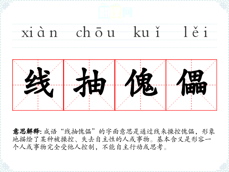 成语“线抽傀儡”的字面意思是通过线来操控傀儡,形象地描绘了某种被操控、失去自主性的人或事物。基本含义是形容一个人或事物完全受他人控制,不能自主行动或思考。