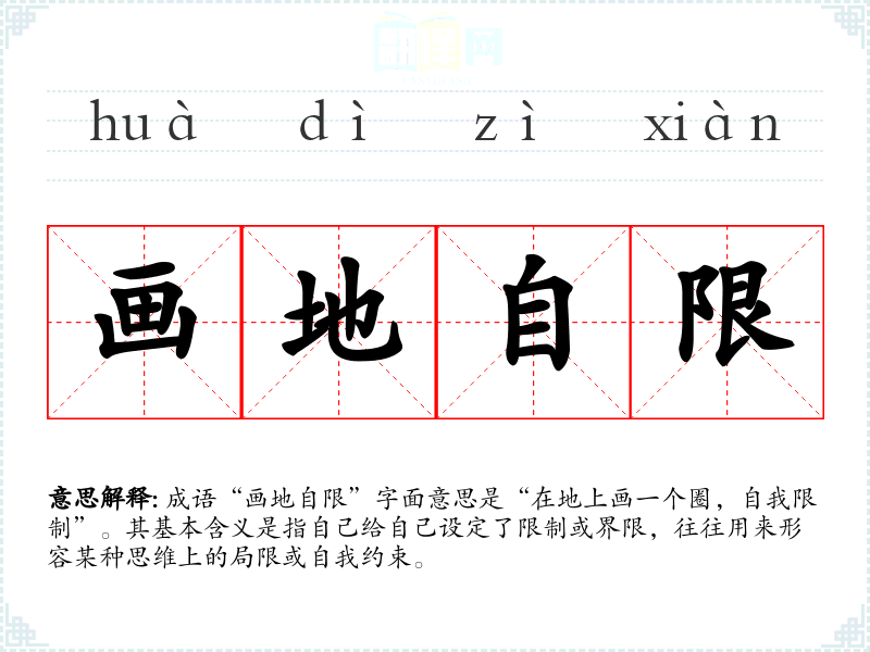 成语“画地自限”字面意思是“在地上画一个圈,自我限制”。其基本含义是指自己给自己设定了限制或界限,往往用来形容某种思维上的局限或自我约束。