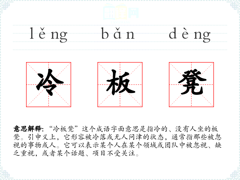 “冷板凳”这个成语字面意思是指冷的、没有人坐的板凳。引申义上,它形容被冷落或无人问津的状态,通常指那些被忽视的事物或人。它可以表示某个人在某个领域或团队中被忽视、缺乏重视,或者某个话题、项目不受关注。