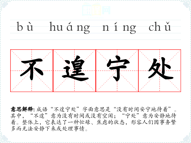 成语“不遑宁处”字面意思是“没有时间安宁地待着”。其中,“不遑”意为没有时间或没有空闲;“宁处”意为安静地待着。整体上,它表达了一种忙碌、焦虑的状态,形容人们因事务繁多而无法安静下来或处理事情。