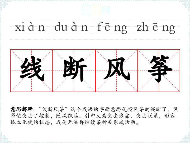 “线断风筝”这个成语的字面意思是指风筝的线断了,风筝便失去了控制,随风飘荡。引申义为失去依靠、失去联系,形容孤立无援的状态,或是无法再继续某种关系或活动。