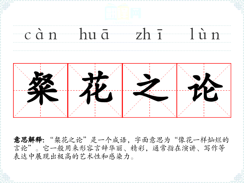 “粲花之论”是一个成语,字面意思为“像花一样灿烂的言论”。它一般用来形容言辞华丽、精彩,通常指在演讲、写作等表达中展现出极高的艺术性和感染力。