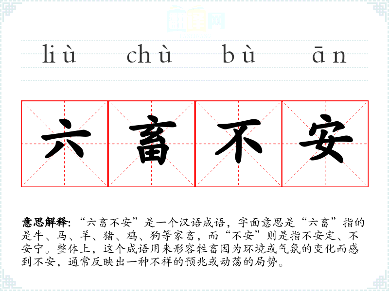 “六畜不安”是一个汉语成语,字面意思是“六畜”指的是牛、马、羊、猪、鸡、狗等家畜,而“不安”则是指不安定、不安宁。整体上,这个成语用来形容牲畜因为环境或气氛的变化而感到不安,通常反映出一种不祥的预兆或动荡的局势。