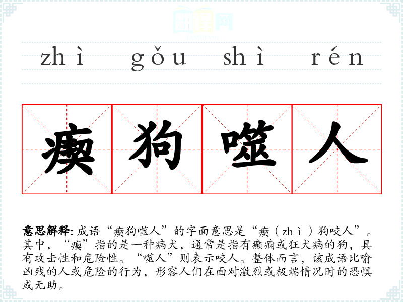 成语“瘈狗噬人”的字面意思是“瘈(zhì)狗咬人”。其中,“瘈”指的是一种病犬,通常是指有癫痫或狂犬病的狗,具有攻击性和危险性。“噬人”则表示咬人。整体而言,该成语比喻凶残的人或危险的行为,形容人们在面对激烈或极端情况时的恐惧或无助。