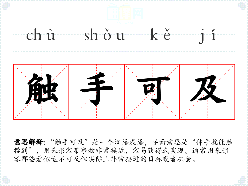 “触手可及”是一个汉语成语,字面意思是“伸手就能触摸到”,用来形容某事物非常接近,容易获得或实现。通常用来形容那些看似遥不可及但实际上非常接近的目标或者机会。