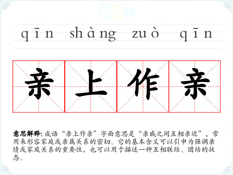 成语“亲上作亲”字面意思是“亲戚之间互相亲近”,常用来形容家庭或亲属关系的密切。它的基本含义可以引申为强调亲情或家庭关系的重要性,也可以用于描述一种互相联结、团结的状态。