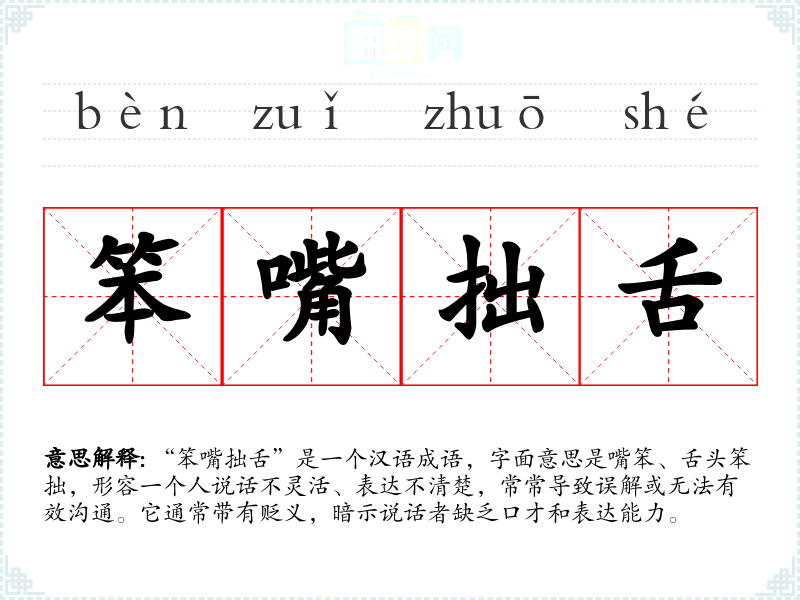 “笨嘴拙舌”是一个汉语成语,字面意思是嘴笨、舌头笨拙,形容一个人说话不灵活、表达不清楚,常常导致误解或无法有效沟通。它通常带有贬义,暗示说话者缺乏口才和表达能力。