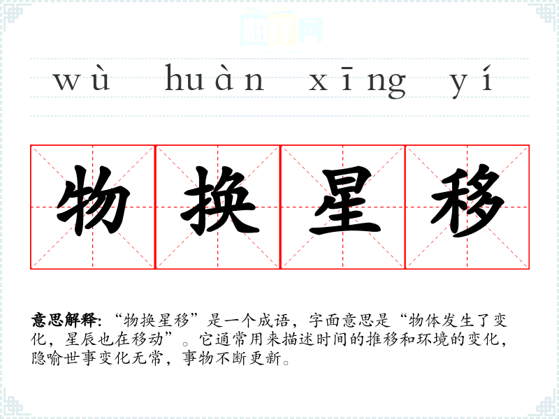 “物换星移”是一个成语,字面意思是“物体发生了变化,星辰也在移动”。它通常用来描述时间的推移和环境的变化,隐喻世事变化无常,事物不断更新。