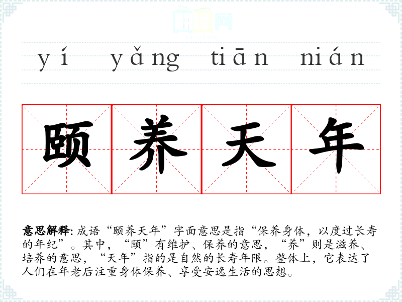 成语“颐养天年”字面意思是指“保养身体,以度过长寿的年纪”。其中,“颐”有维护、保养的意思,“养”则是滋养、培养的意思,“天年”指的是自然的长寿年限。整体上,它表达了人们在年老后注重身体保养、享受安逸生活的思想。