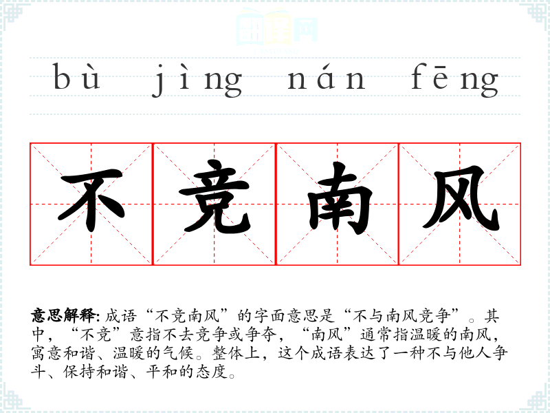 通过对“不竞南风”的学,我认识到在语言学中,理解成语的深层含义和文化背景是非常重要的。它不仅丰富了我的表达,也让我在面对生活中的压力时,能更好地保持内心的平和与宁静。