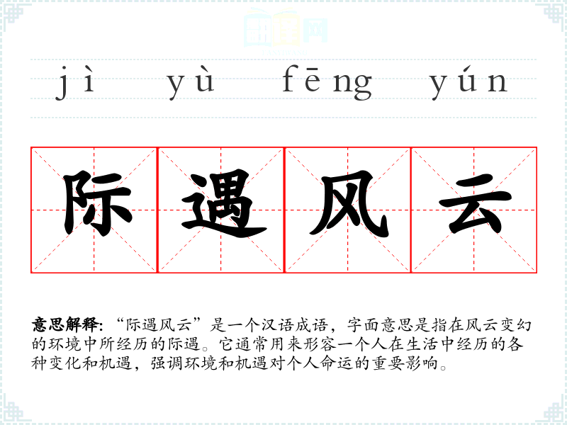 “际遇风云”是一个汉语成语,字面意思是指在风云变幻的环境中所经历的际遇。它通常用来形容一个人在生活中经历的各种变化和机遇,强调环境和机遇对个人命运的重要影响。