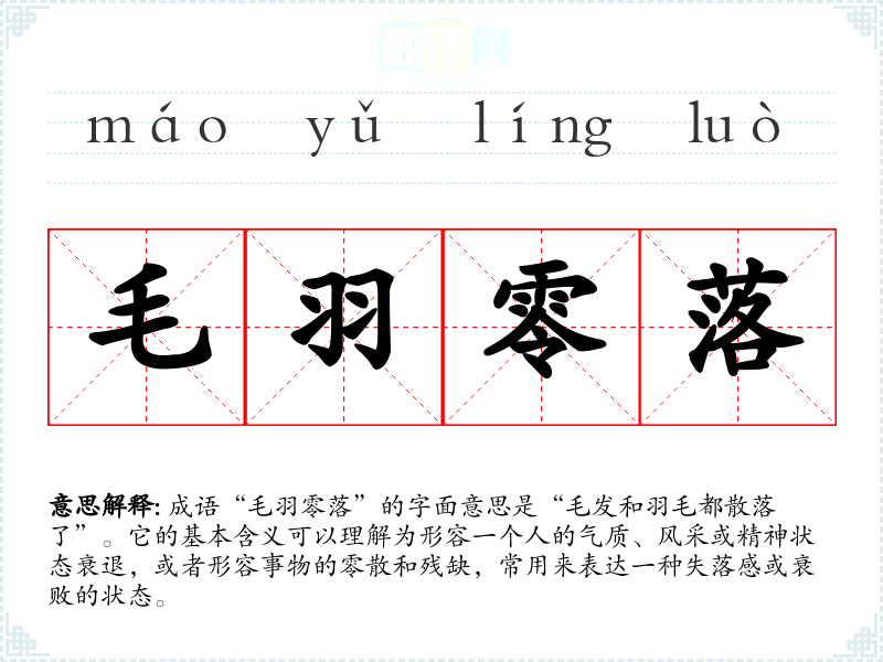 成语“毛羽零落”的字面意思是“毛发和羽毛都散落了”。它的基本含义可以理解为形容一个人的气质、风采或精神状态衰退,或者形容事物的零散和残缺,常用来表达一种失落感或衰败的状态。