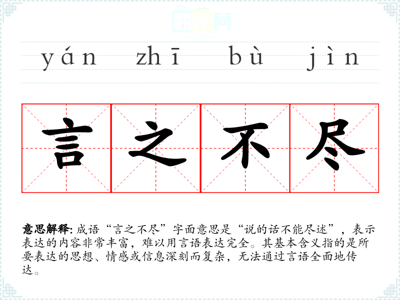 “言之不尽”常用于文学作品、演讲、日常对话等场合,尤其是在描述复杂情感、深刻思想或广泛话题时。它可以用于表达对某一主题的深入思考,或在讨论中指出某种观点的难以言尽。