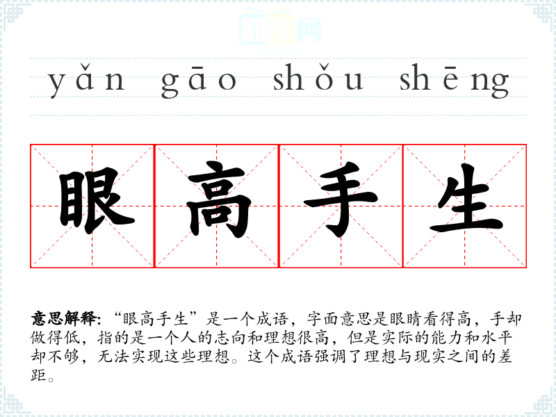 “眼高手生”是一个成语,字面意思是眼睛看得高,手却做得低,指的是一个人的志向和理想很高,但是实际的能力和水平却不够,无法实现这些理想。这个成语强调了理想与现实之间的差距。