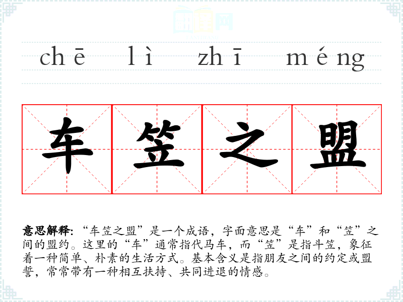 “车笠之盟”是一个成语,字面意思是“车”和“笠”之间的盟约。这里的“车”通常指代马车,而“笠”是指斗笠,象征着一种简单、朴素的生活方式。基本含义是指朋友之间的约定或盟誓,常常带有一种相互扶持、共同进退的情感。