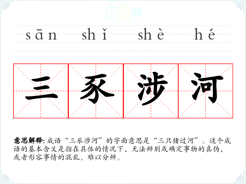 成语“三豕涉河”的字面意思是“三只猪过河”。这个成语的基本含义是指在具体的情况下,无法辨别或确定事物的真伪,或者形容事情的混乱、难以分辨。