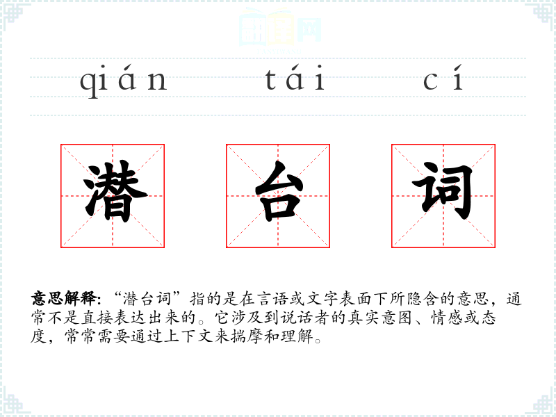 “潜台词”指的是在言语或文字表面下所隐含的意思,通常不是直接表达出来的。它涉及到说话者的真实意图、情感或态度,常常需要通过上下文来揣摩和理解。