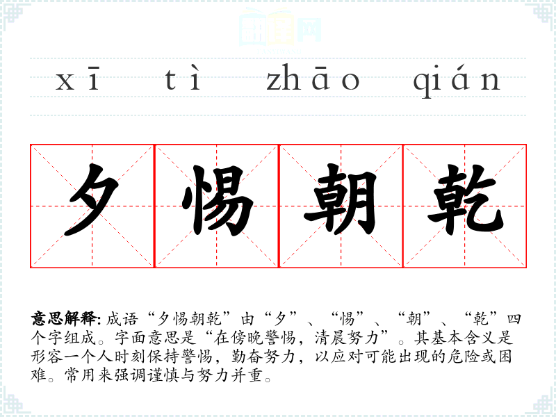成语“夕惕朝乾”由“夕”、“惕”、“朝”、“乾”四个字组成。字面意思是“在傍晚警惕,清晨努力”。其基本含义是形容一个人时刻保持警惕,勤奋努力,以应对可能出现的危险或困难。常用来强调谨慎与努力并重。