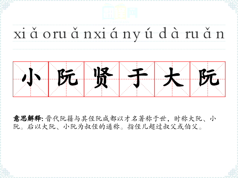 | 小阮贤于大阮 | 晋代阮籍与其侄阮咸都以才名著称于世,时称大阮、小阮。后以大阮、小阮为叔侄的通称。指侄儿超过叔父或伯父。 |