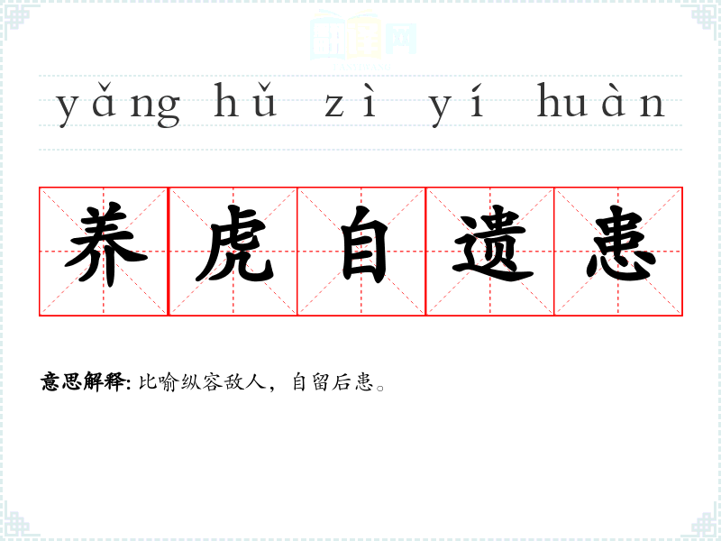 | 养痈自患 | 痈:毒疮。留着毒疮不去医治,就会成为后患。比喻纵容包庇坏人坏事,结果会遭受祸害。 |