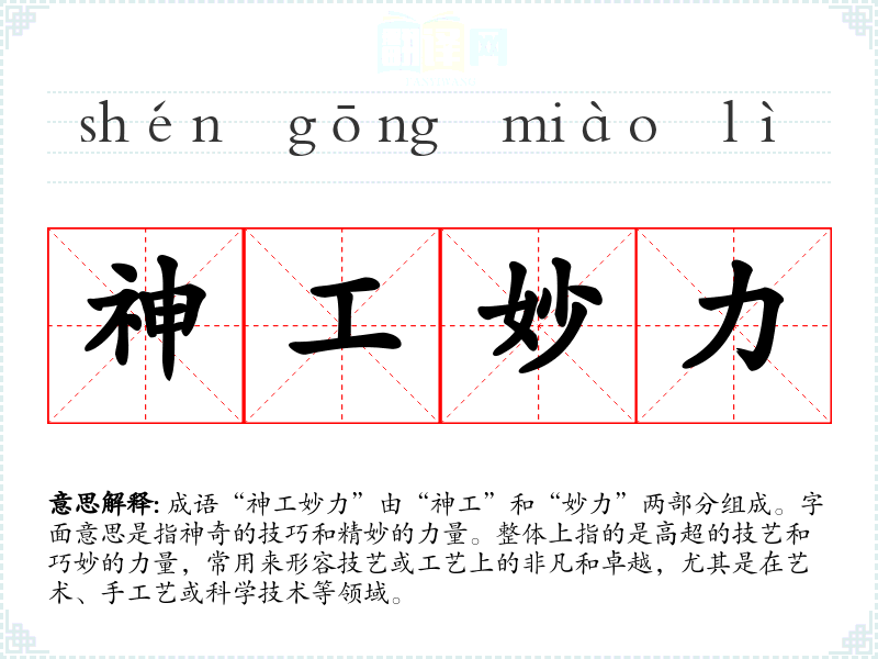 成语“神工妙力”由“神工”和“妙力”两部分组成。字面意思是指神奇的技巧和精妙的力量。整体上指的是高超的技艺和巧妙的力量,常用来形容技艺或工艺上的非凡和卓越,尤其是在艺术、手工艺或科学技术等领域。