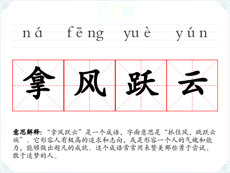 “拿风跃云”是一个成语,字面意思是“抓住风,跳跃云端”。它形容人有极高的追求和志向,或是形容一个人的气魄和能力,能够做出超凡的成就。这个成语常常用来赞美那些勇于尝试、敢于追梦的人。