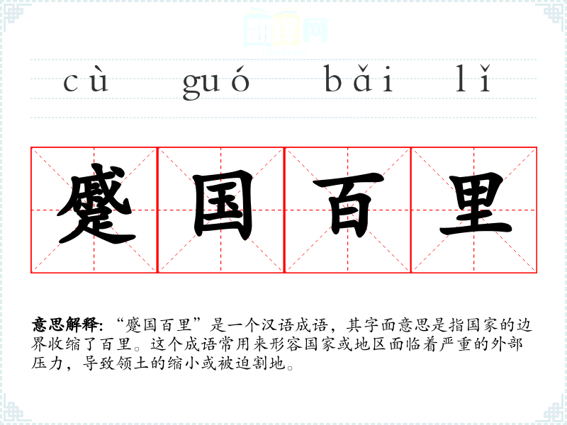 “蹙国百里”是一个汉语成语,其字面意思是指国家的边界收缩了百里。这个成语常用来形容国家或地区面临着严重的外部压力,导致领土的缩小或被迫割地。