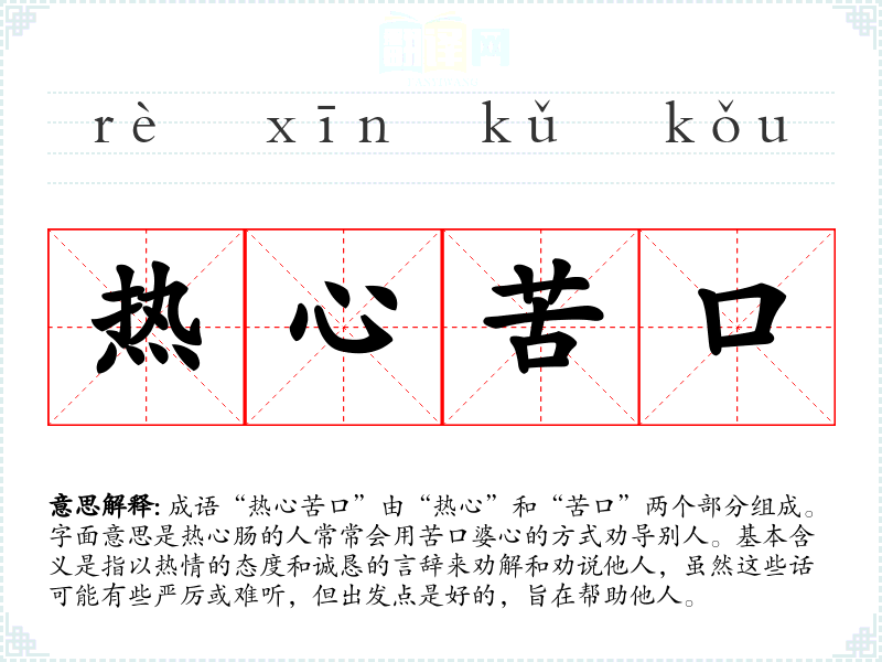 “热心苦口”并没有明确的典故或历史出处,但可以推测其形成与古代传统的劝善劝诫文化有关。在**传统文化中,长辈或有经验的人常常以“苦口婆心”的方式来教导年轻人,强调的是关心和爱护的情感。