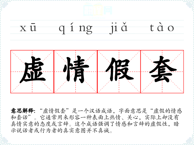 “虚情假套”是一个汉语成语,字面意思是“虚假的情感和套话”。它通常用来形容一种表面上热情、关心,实际上却没有真情实意的态度或言辞。这个成语强调了情感和言辞的虚假性,暗示说话者或行为者的真实意图并不真诚。