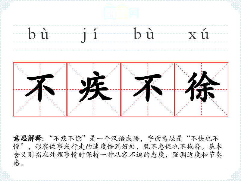 “不疾不徐”是一个汉语成语,字面意思是“不快也不慢”,形容做事或行走的速度恰到好处,既不急促也不拖沓。基本含义则指在处理事情时保持一种从容不迫的态度,强调适度和节奏感。